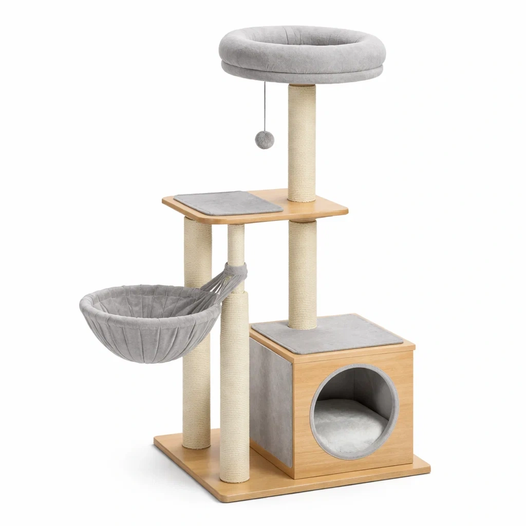 Kratzbaum aus mdf holz grau mit hängematte und spielzeug