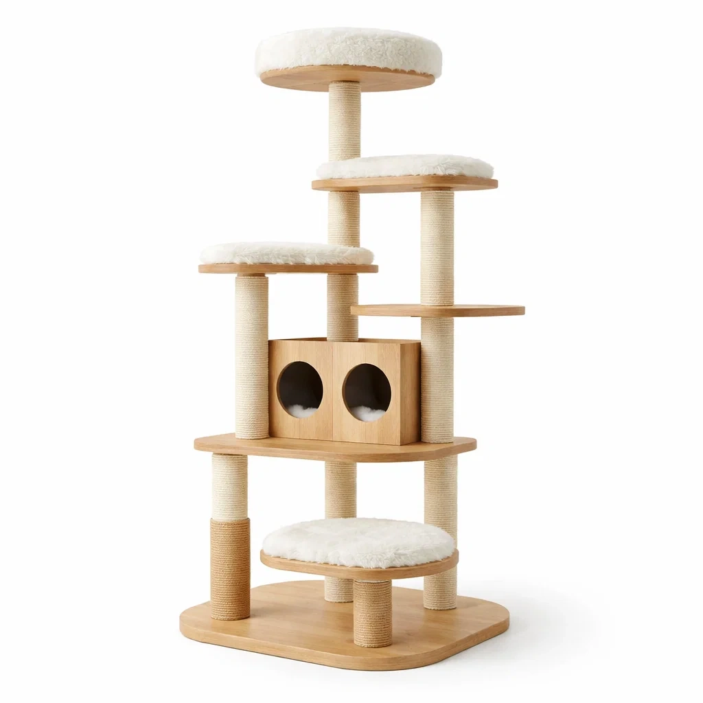 Kratzbaum aus sperrholz mit sisal und plüsch natur creme