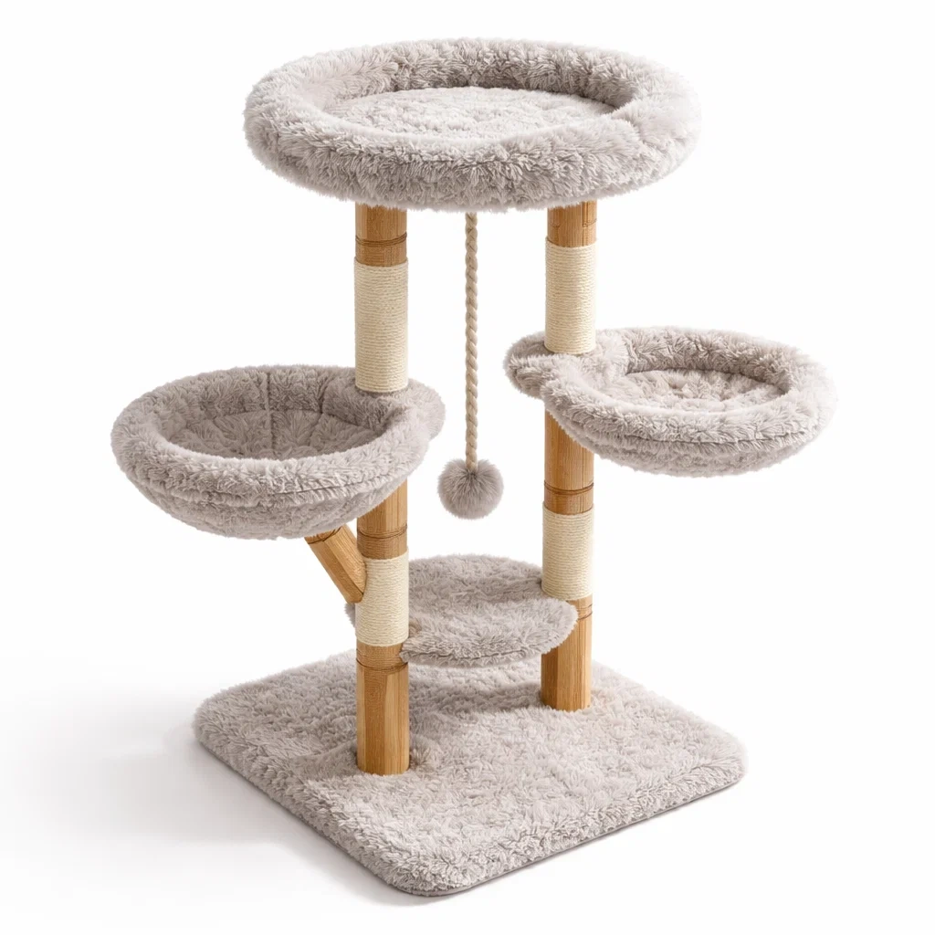 Der Kratzbaum besteht aus weichem Polyesterplüsch, robustem Sisalseil und einer stabilen Holzstruktur. Er hat drei Ebenen mit kuscheligem Plüschbezug und bietet Platz zum Klettern und Ausruhen. Ein integriertes Sisalseil erfüllt das natürliche Kratzbedürfnis von Katzen. Maße: Höhe 90 cm, Breite 60 cm, Tiefe 40 cm.